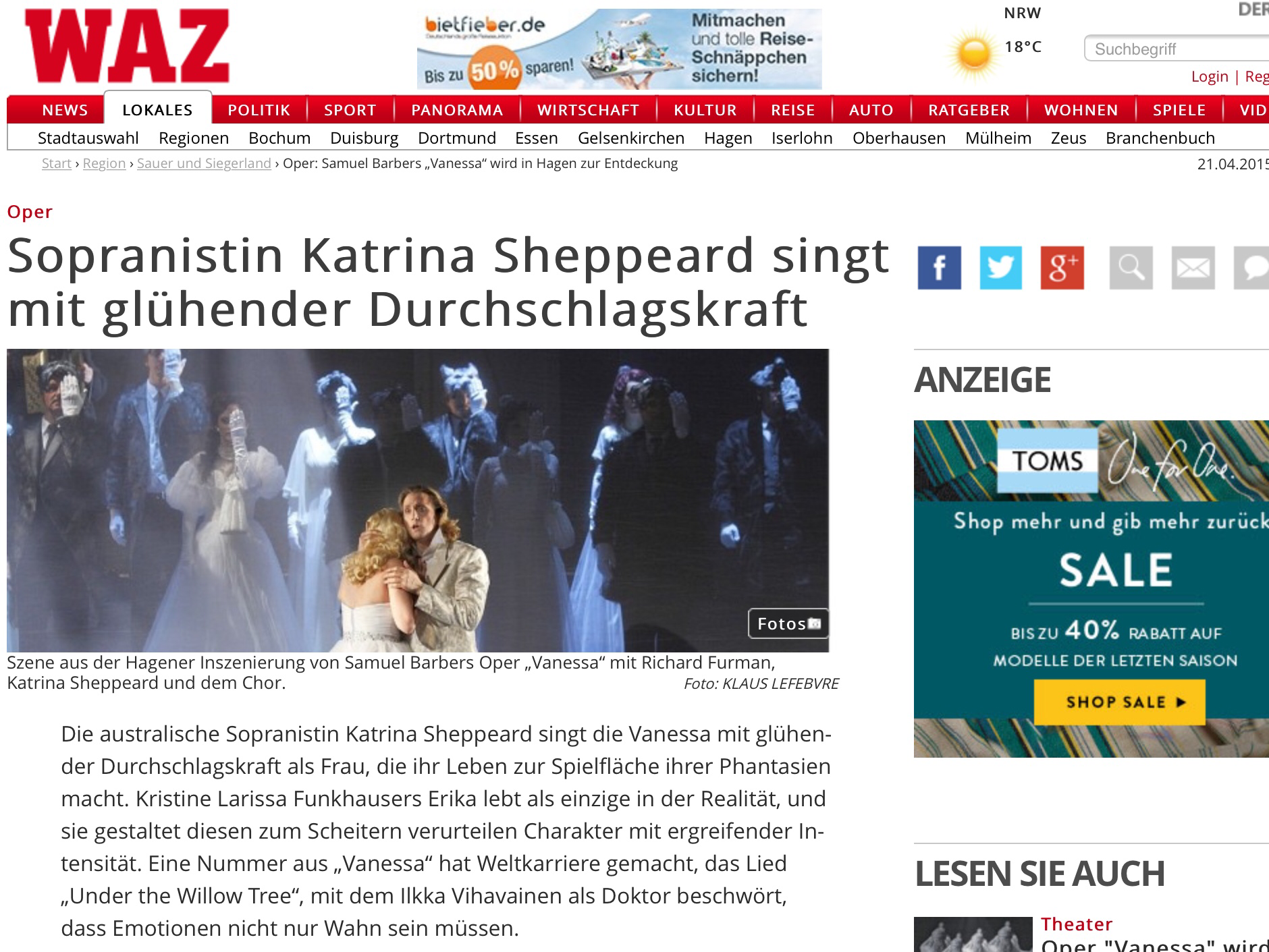“Die australische Sopranistin Katrina Sheppeard singt die Vanessa mit glühender Durchschlagskraft als Frau, die ihr Leben zur Spielfläche ihrer Phantasien macht.” (The Australian soprano Katrina Sheppeard sings the Vanessa with glowing penetrating power as a woman who makes her life the playing surface of her fantasies.) Monika Willer, Waz.de